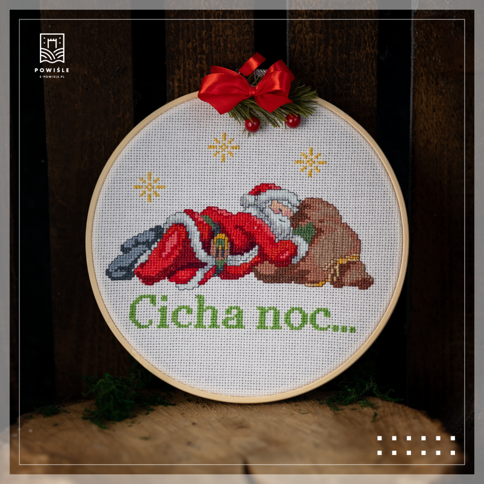 Ręcznie haftowana dekoracja z motywem Mikołaja odpoczywającego po pracy i napisem „Cicha noc”. Ciepły akcent świąteczny, idealny na ścianę, kominek lub jako prezent. Wyjątkowe rękodzieło z Kwidzyna, które wnosi magię i spokój świąt do Twojego domu. 🎄✨