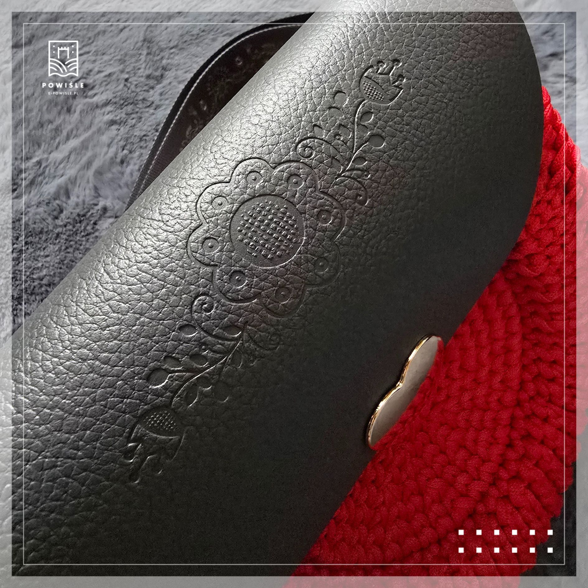 - grafitowa, skórzana klapka, na której wytłoczono motyw kwiatowy wzoru powiślańskiego